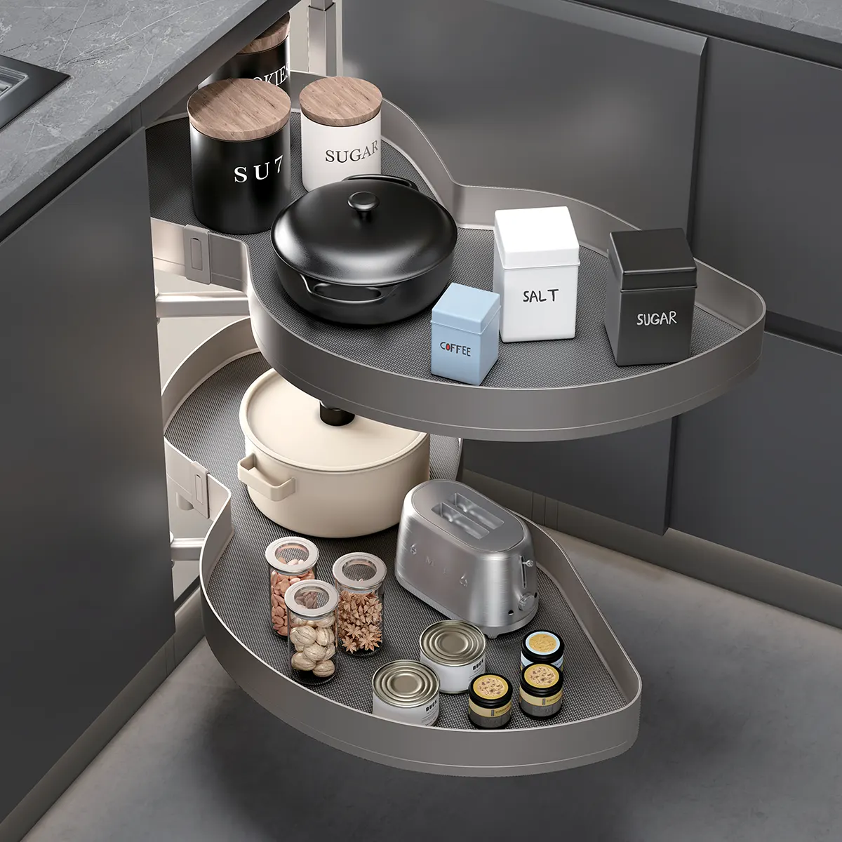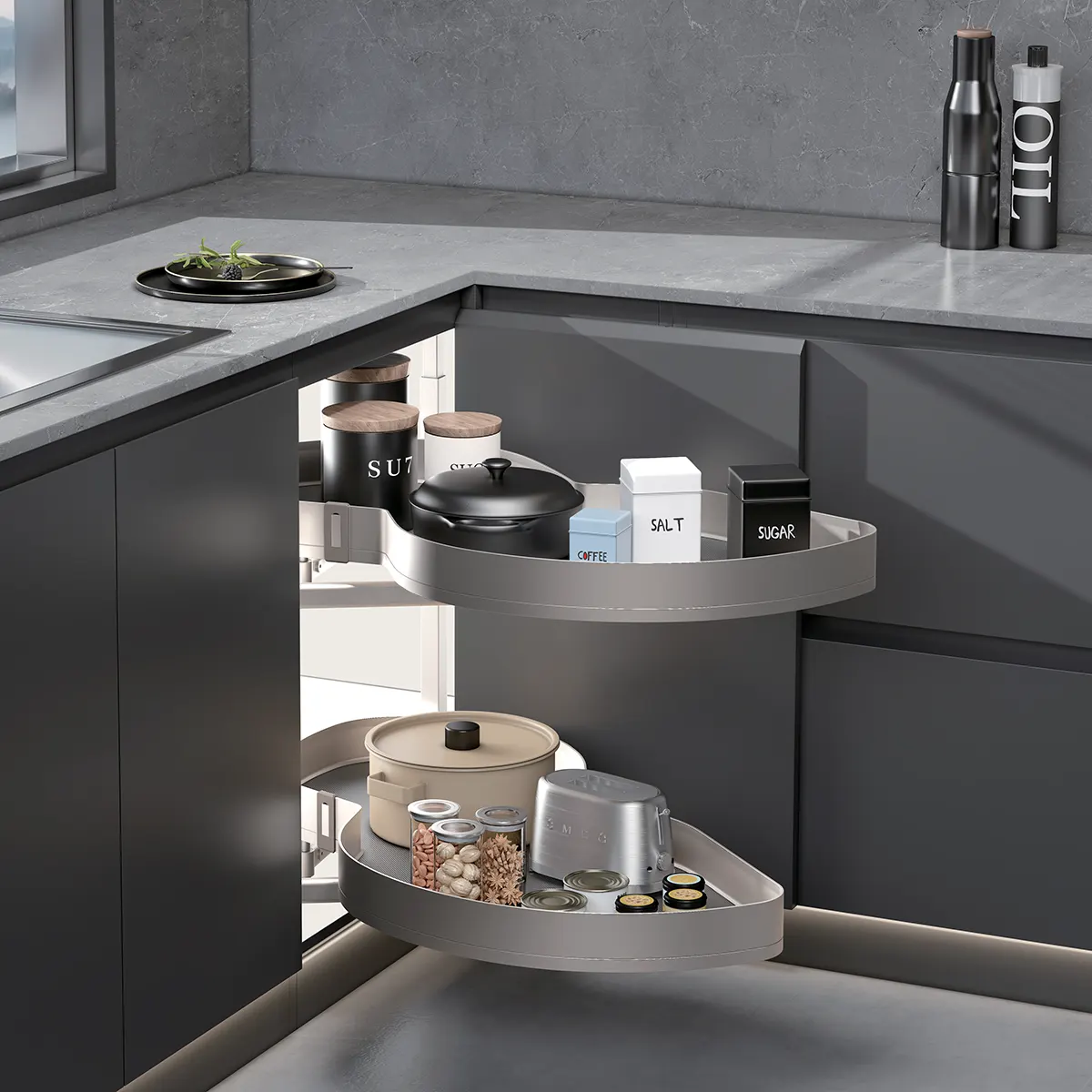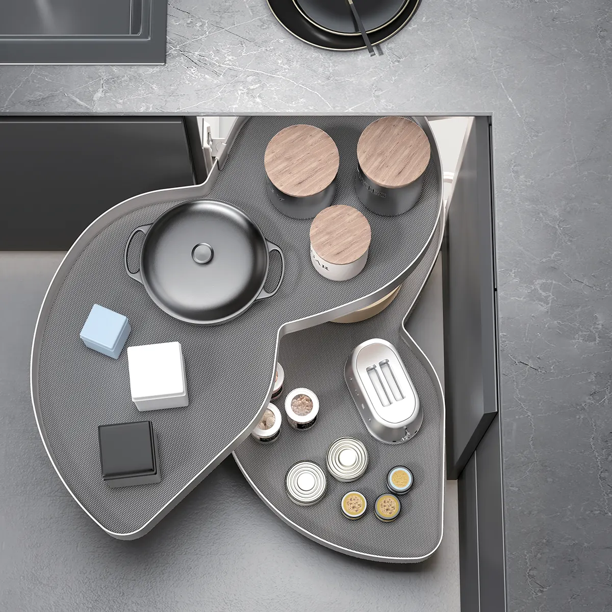Optimize your corner cabinet storage with the Leman Magic Corner – Elan in Champagne Gold. This pull-out Magic Corner unit features a smooth sliding and folding mechanism that brings hard-to-reach items within easy access. Its anti-slip trays keep kitchen essentials secure, while the slim profile ensures a space-efficient and stylish solution. Available in left-opening and right-opening models, it provides the perfect fit for any corner cabinet layout.